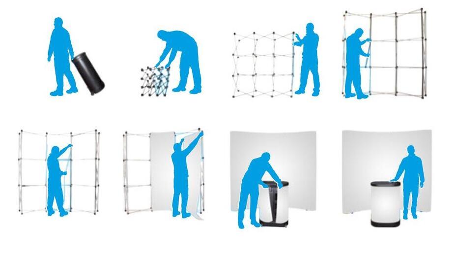 O pop up displays ”, também conhecidos como estandes de quadro de alumínio escovado reto ou curvo que é leve, mas resistente.